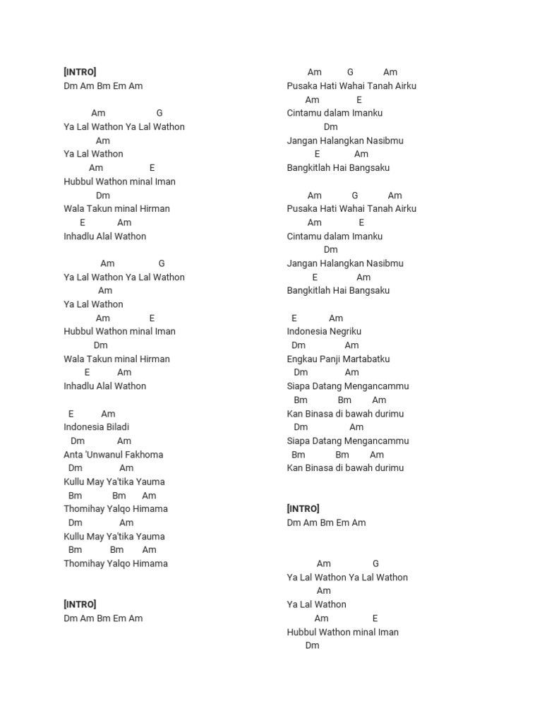 3 2 4 3 1 5. Ngelengake ojo turu sore. Capo di fret 2 Intro Gm Dm Em Am Dm Dm C Ya Lal Wathon Ya Lal Wathon Dm Ya Lal Wathon Dm A Hubbul Wathon minal Iman Gm Wala Takun minal Hirman A Dm.